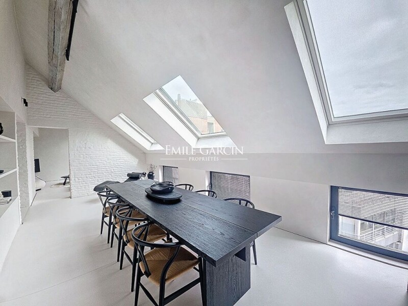 Discover this sumptuous architect-designed loft of ± 200 sqm, nestled on the top floor of a building completely renovated in 2020, in the heart of the popular Ste-Catherine district. Combining elegance and modernity, this unique property offers you an exceptional living environment, both refined and warm. Its vast receptions bathed in light, its polished concrete floor and its high-end finishes will seduce you from the entrance. Accessible by elevator, the loft has a living space composed of an entrance hall, a dining room, a living room and a fitted oak kitchen (Miele) opening onto a terrace. The second level offers a patio with bar, a terrace, a bedroom with bathroom, a dressing room/bedroom with shower room, and a laundry room. On the third level, a master suite with a walk-in shower room completes this exceptional property. A cellar in the basement offers additional storage space. Comfort features: Home automation system, underfloor heating, triple glazing, alarm, individual gas boiler and private water softener.