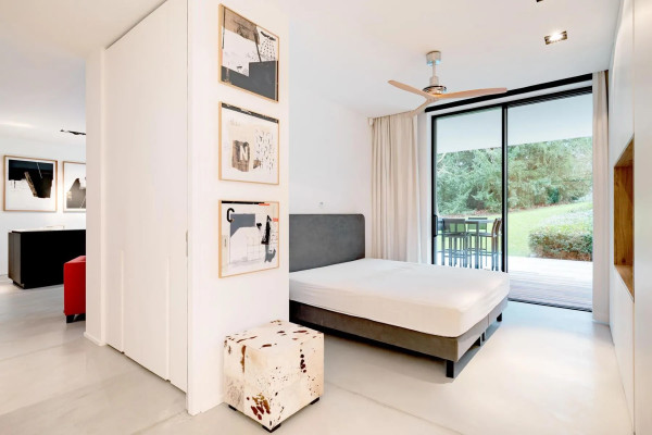 The flat is composed of an entrance hall with guest toilets, a living room opening onto the west-facing terrace, a fully equipped American kitchen and a pleasant office area. The night area includes a suite with a dressing room and a complete bathroom. The whole is completed by a parking space.